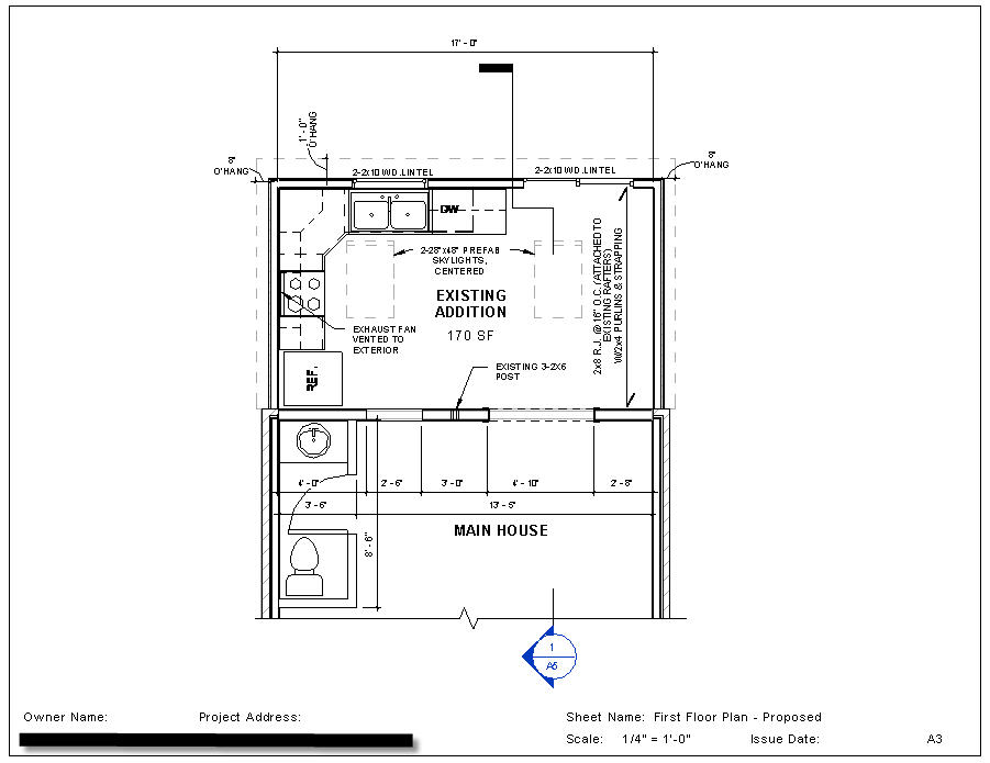 A3 is the current view we're looking at. For phasing this is a 'Phase 1, Show Complete' plan. The skylights and overhang are the actual model objects, not just lines. In other words, if anything changes with the roof or skylights the plan will reflect those changes in real time. It's important to work with this philosophy as much as possible. The structural symbols denoting the roof joists and lintels are just text and lines. They are grouped and named accordingly so I can reproduce them. This kind of thing is better served with either a tag or a family but I just didn't do it this time (shame on me). I'll do better next time, I promise.